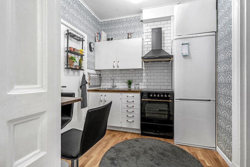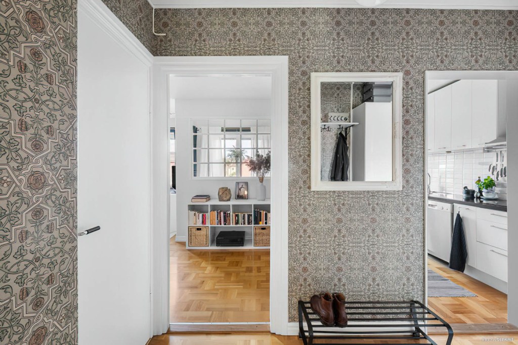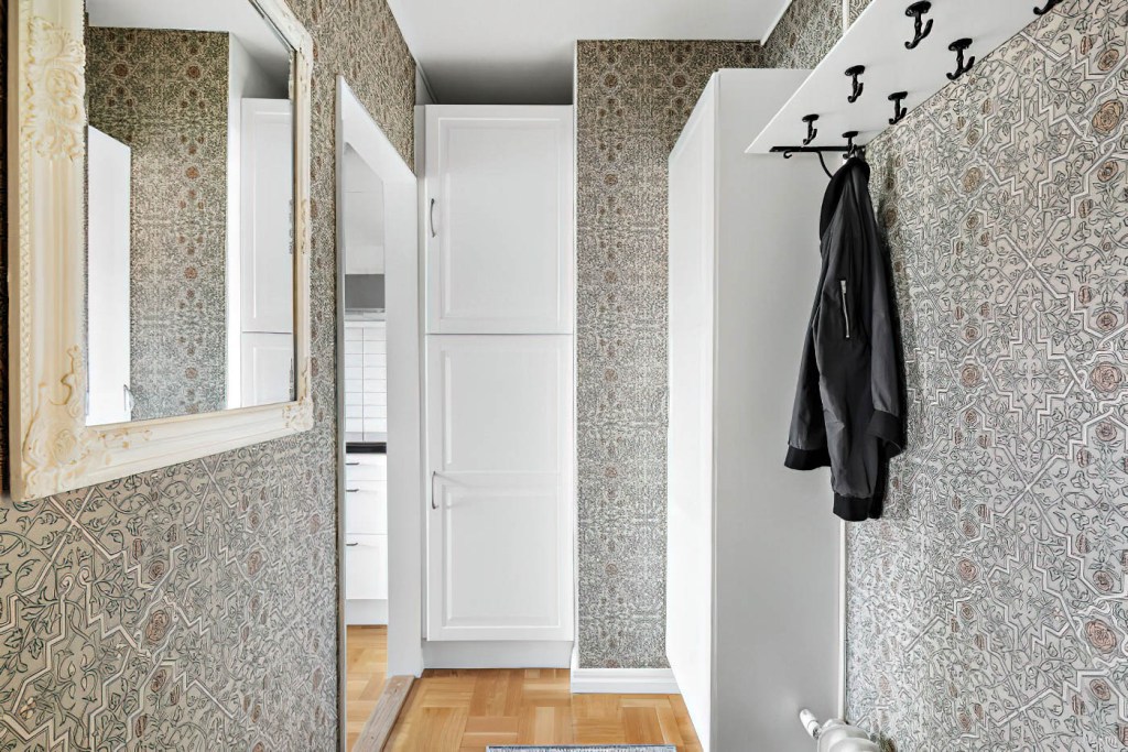 A är intresserad av historia och valde själv tapet till hallen, en reproduktion av Sveriges äldsta papperstapet. Till köket föreslog jag att han skulle följa lägenhetens byggår och titta på tapeter som flirtar med funkis, så där blev det en blågrå retrotapet som lirar fint med hans ärvda köksbord med perstorpskiva. Den biten var lätt!