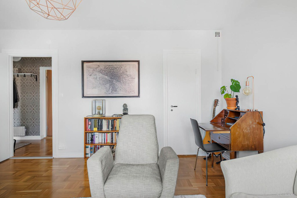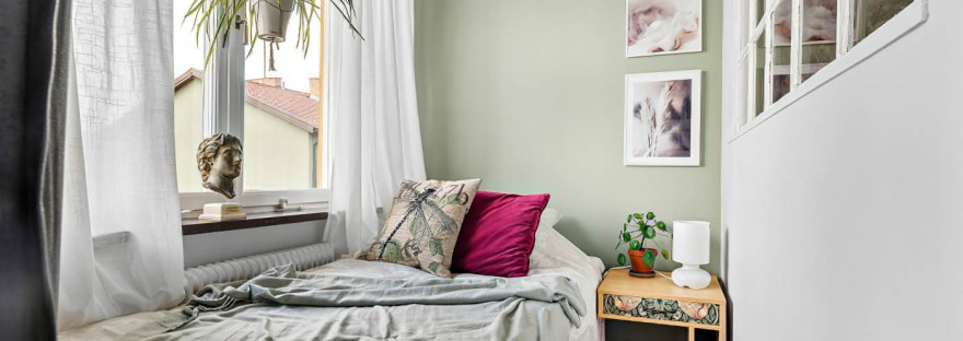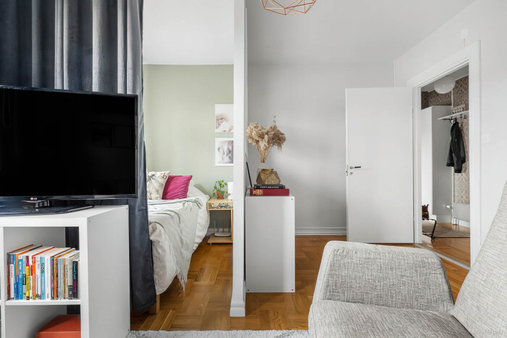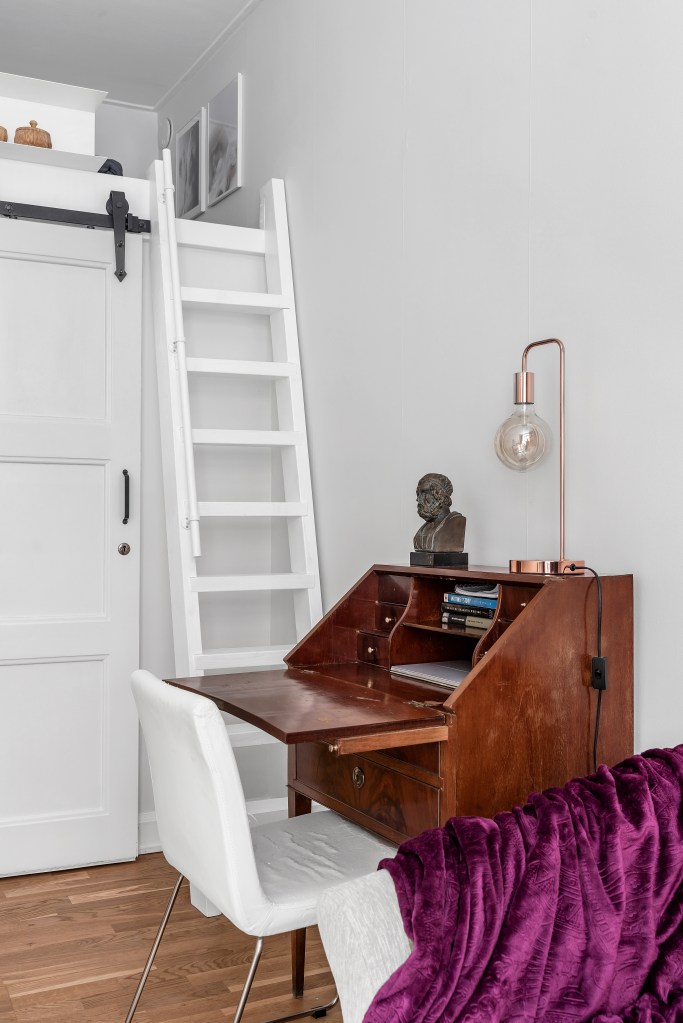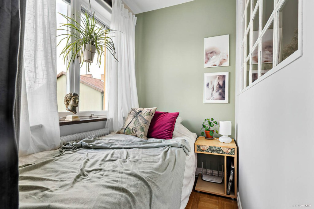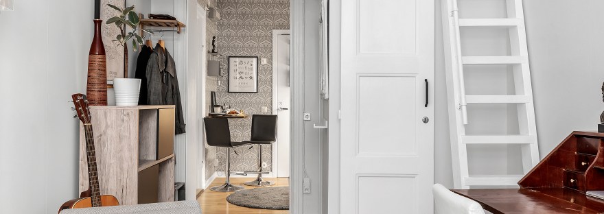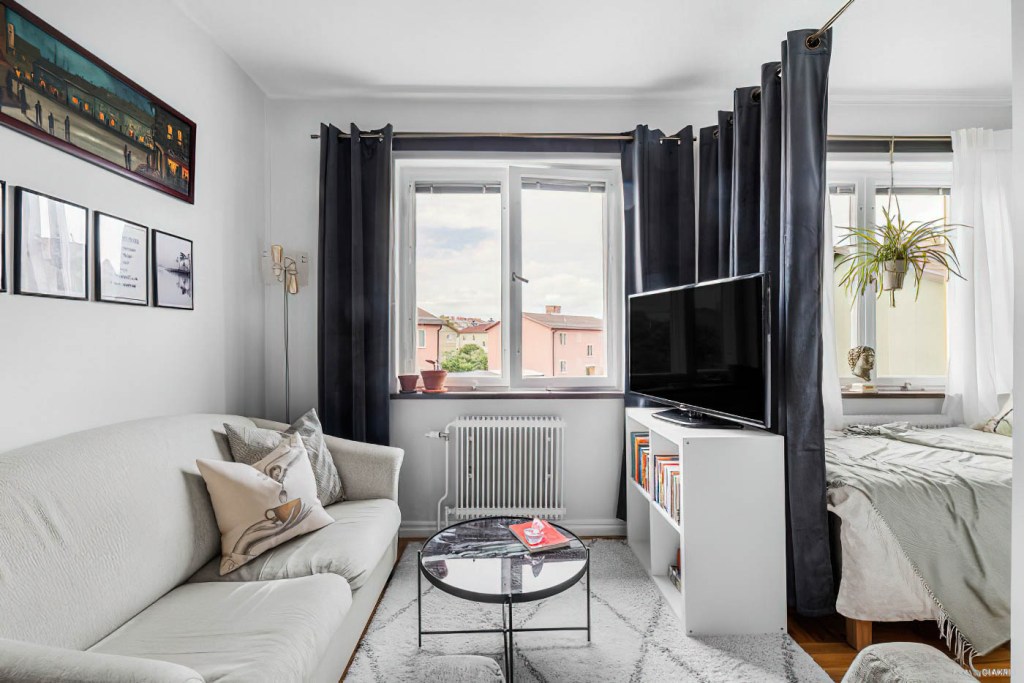 Så flyttade han in och upptäckte att trots sina egna, något mindre möbler, var det helt enkelt ett svårmöblerat rum. Två stora fönster på ena långväggen och två dörrar på den andra gjorde det omöjligt att till exempel bygga sovloft. Och inte skulle det väl egentligen behöva vara ett problem att få in både säng och soffa i det där stora rummet på hela 17 kvadrat? Dessutom borde det väl gå att mysa till lägenheten lite mer?