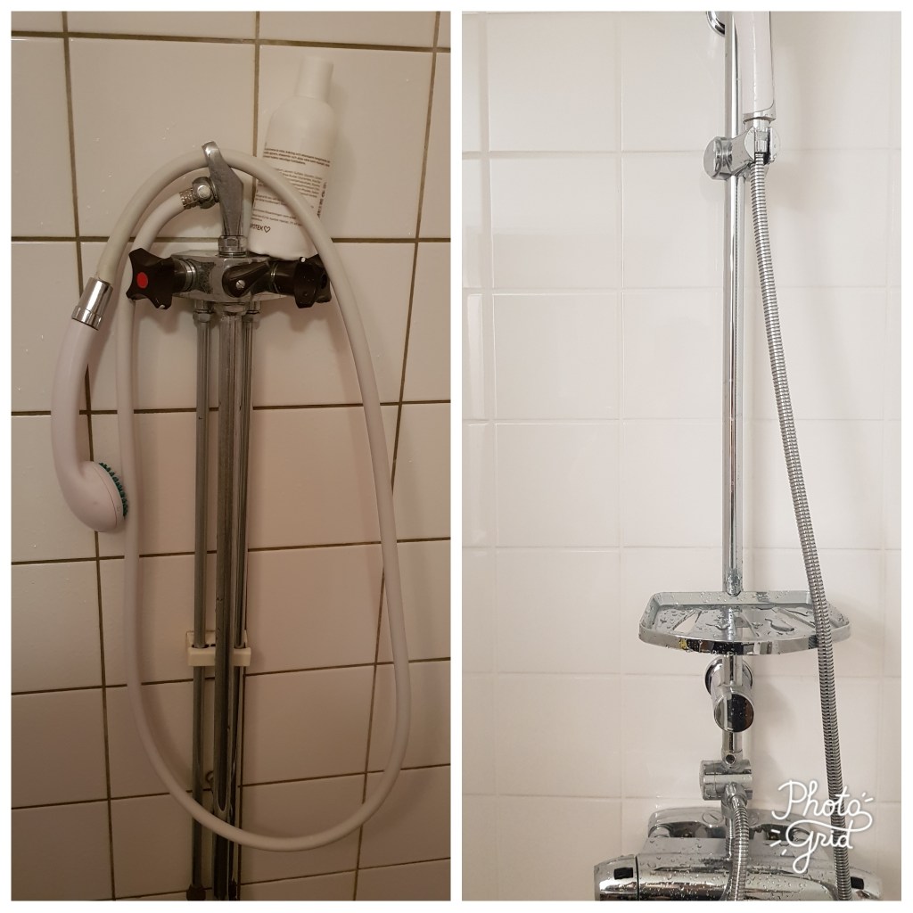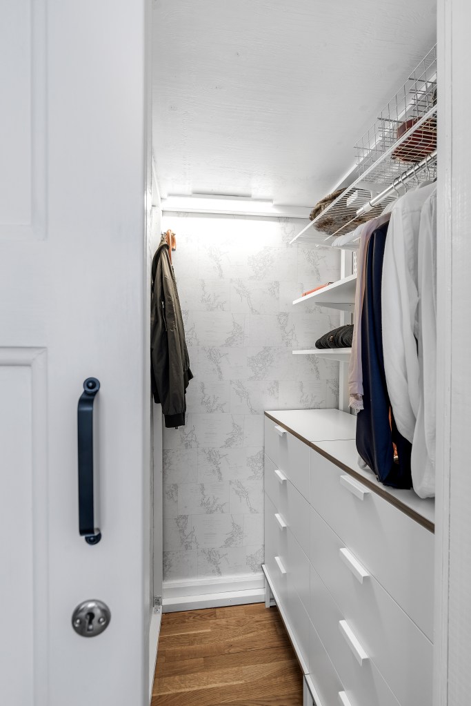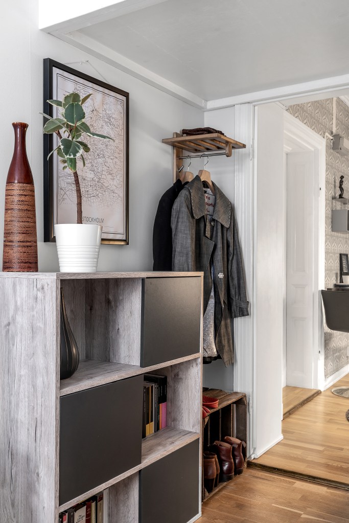 Sen var det bara den roliga biten kvar – att möblera och se hur mycket mer praktiskt rummet blev! A själv blev väldigt nöjd med att lägenheten märkligt nog kändes större. Jag kompletterade hans befintliga möblemang med några uppgraderade återbruksdetaljer, som ett litet sängbord (vilket han tidigare inte hade fått plats med).