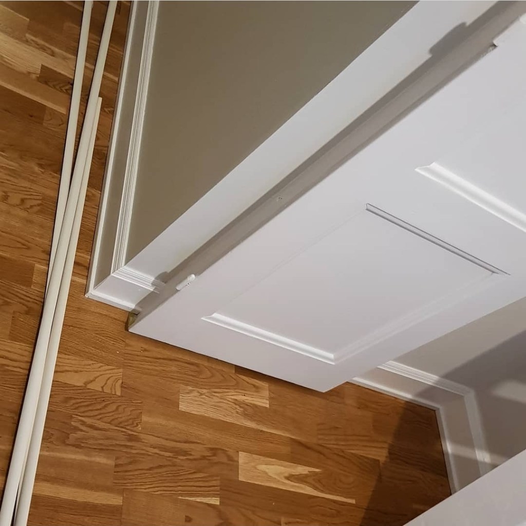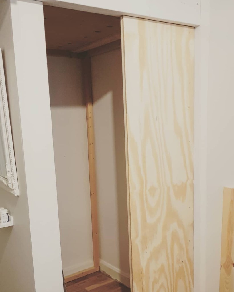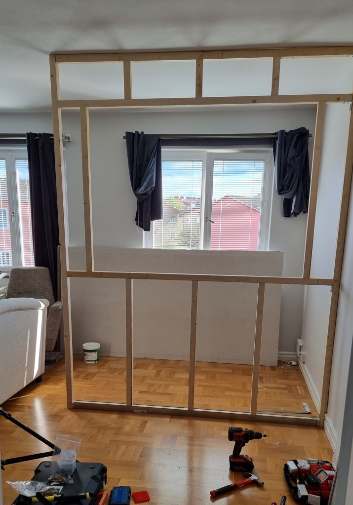 Eftersom det inte är en vägg som ska belastas utan bara skilja av en del av rummet, gjorde jag den så smal som möjligt så att den inte skulle äta upp för mycket golvyta. Den kläddes i gips, spacklades och målades innan samma list som i resten av rummet sattes. Och så satte jag in det nyrenoverade fönstret.