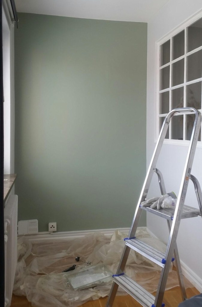 När väggen var klar målades den gamla fondtapeten (som var för rörig och mörk för A:s smak) och resten av rummet med en ljus neutralgrå färg. I stället målades en mjukt grågrön fondvägg i den nya sovalkoven.
