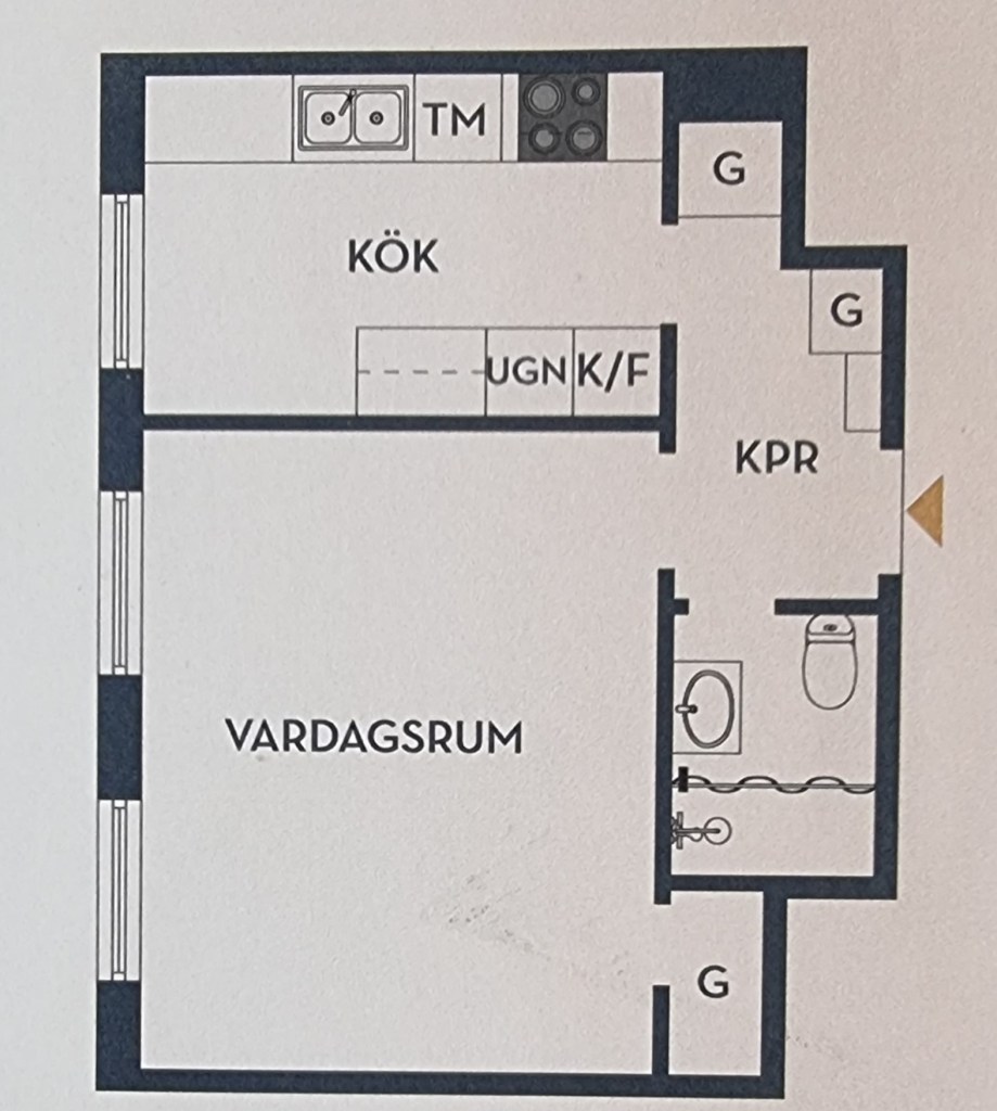 När A köpte sin lägenhet var det på pappret en ganska vanlig men stor etta i hyfsat skick och med ett bra kök. När han var på visning hade han tänkt att säljaren hade många och stora möbler, och att det säkert gick att disponera utrymmet bättre. Då såg lägenheten ut så här: